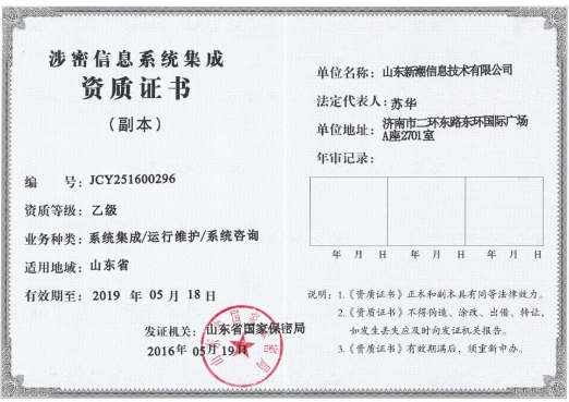 2016年5月,我公司獲得山東省保密局頒發(fā)的涉密信息信息系統(tǒng)集成資質(zhì),業(yè)務(wù)范圍包括:系統(tǒng)集成、運(yùn)行維護(hù)、系統(tǒng)咨詢,此證書(shū)成為我公司發(fā)展的又一里程碑。