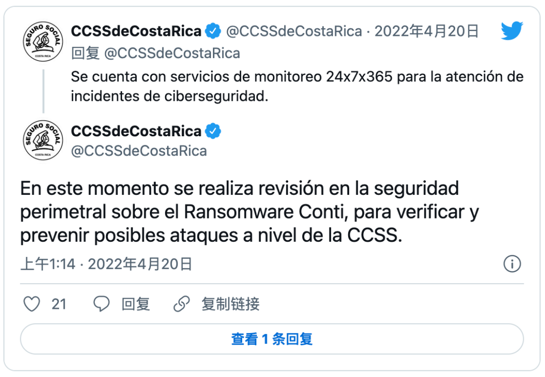 此前,4月份哥斯達黎加就遭遇了黑客攻擊。報道稱,截至當?shù)貢r間4月22日,因遭到國際黑客攻擊,哥斯達黎加部分政府公共服務網(wǎng)絡仍處于關(guān)閉狀態(tài)。
