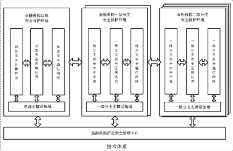 技術(shù)體系:參考《信息安全技術(shù) 信息系統(tǒng)等級(jí)保護(hù)安全設(shè)計(jì)技術(shù)要求》(GB/T 25070-2010)的安全域模型,將“安全域縱深防護(hù)”、“多層次立體防御” 和“信息安全等級(jí)保護(hù)”等安全防護(hù)思想相結(jié)合,建立金融行業(yè)信息安全保障技術(shù)體系模型。依據(jù)金融行業(yè)的組織結(jié)構(gòu)、網(wǎng)絡(luò)架構(gòu)將每個(gè)機(jī)構(gòu)作為一個(gè)整體保護(hù)對(duì)象,設(shè)計(jì)金融機(jī)構(gòu)信息安全保障框架,總部和各個(gè)分支機(jī)構(gòu)都是獨(dú)立的安全域,每個(gè)安全域又細(xì)分計(jì)算環(huán)境域、區(qū)域邊界、通信網(wǎng)絡(luò)和支撐設(shè)施域。