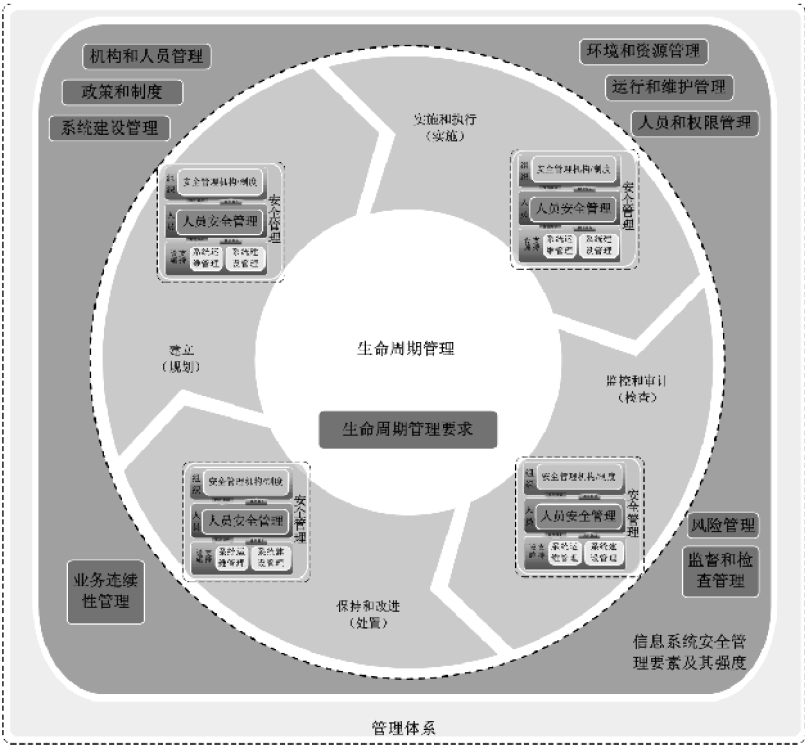 管理體系:要建成完善的安全管理體系,首先根據(jù)金融機(jī)構(gòu)信息化建設(shè)進(jìn)程的實(shí)際需求,逐步建立起安全管理機(jī)構(gòu)、各項(xiàng)安全管理制度及人員配置;其次通過專職安全機(jī)構(gòu)、人員對(duì)制度的執(zhí)行,提高信息安全保障能力;后續(xù)根據(jù)執(zhí)行結(jié)果檢查各項(xiàng)制度存在的問題和缺陷;最后依據(jù)檢查結(jié)果對(duì)制度進(jìn)行改進(jìn)。從而形成建立、實(shí)施和執(zhí)行、監(jiān)控和審計(jì)、保持和改進(jìn)的循環(huán)過程,形成完善的管理體系。